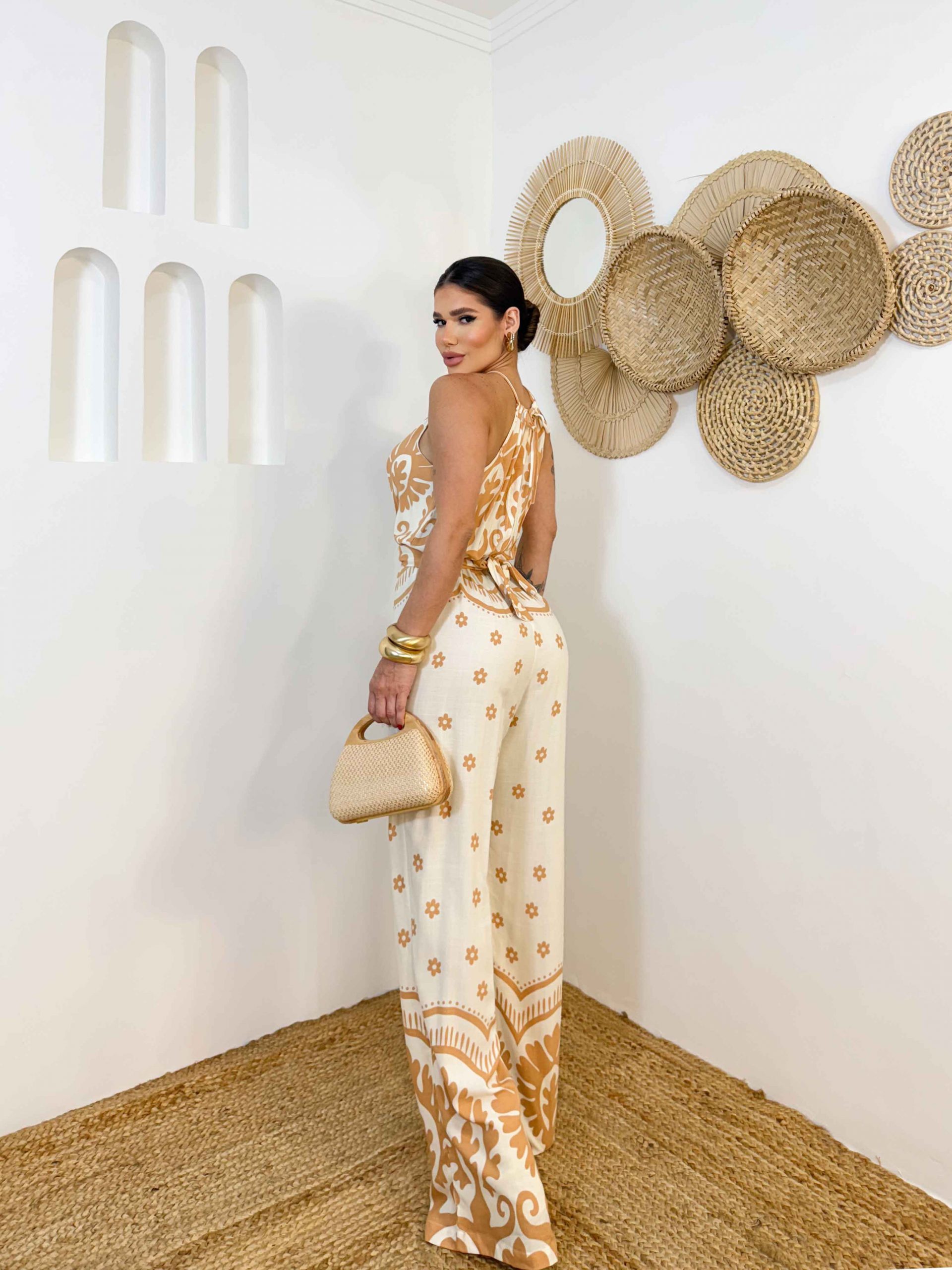 Com elástico na cintura, amarração atrás com faixa e uma estampa leve e moderna, ele é aquele tipo de roupa que você coloca e já se sente pronta pra arrasar — do passeio à tarde até um jantar descontraído.