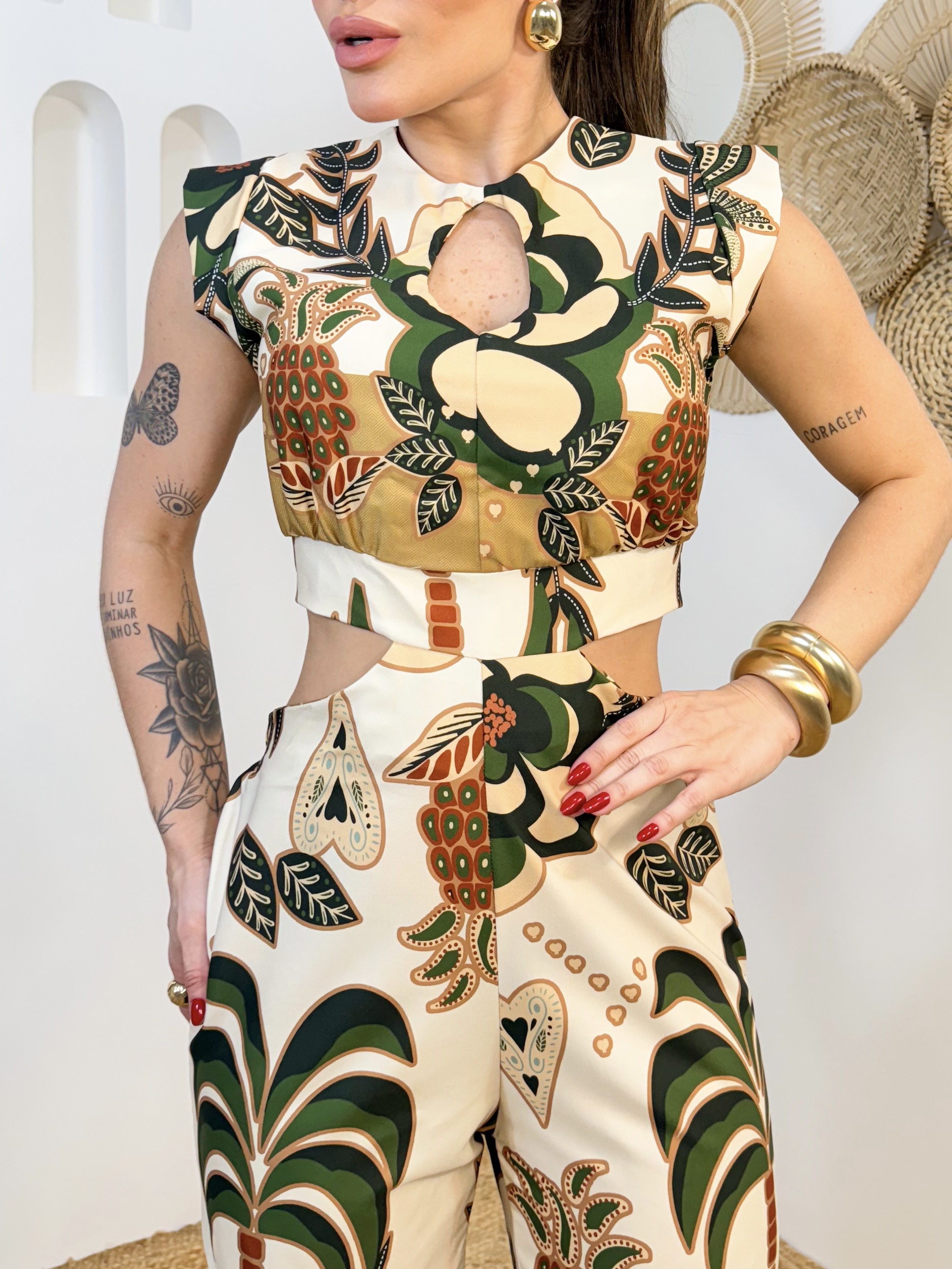 Esse é o tipo de macacão que entra no look e já transforma tudo. A estampa Coração Selvagem tem uma pegada única, com animal print repaginado e cores marcantes. O modelo traz uma vibe super atual com decote em gota frontal, costas abertas, amarração ajustável e botão nas costas – sensual na medida certa e com aquele toque fashion que a gente ama!