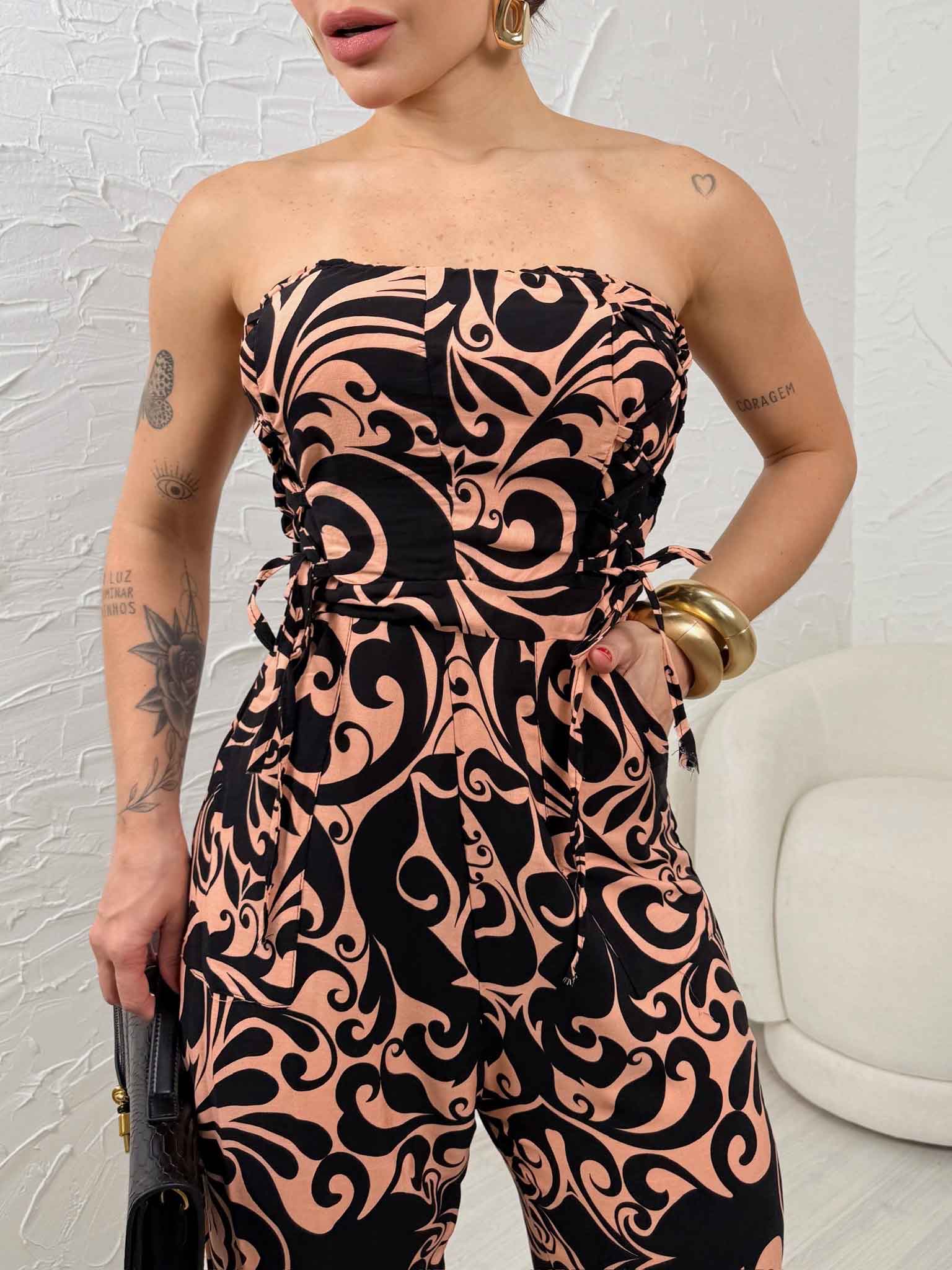 Com trançado no busto, tomara que caia, lastex nas costas e zíper atrás, esse macacão oferece um ajuste perfeito,