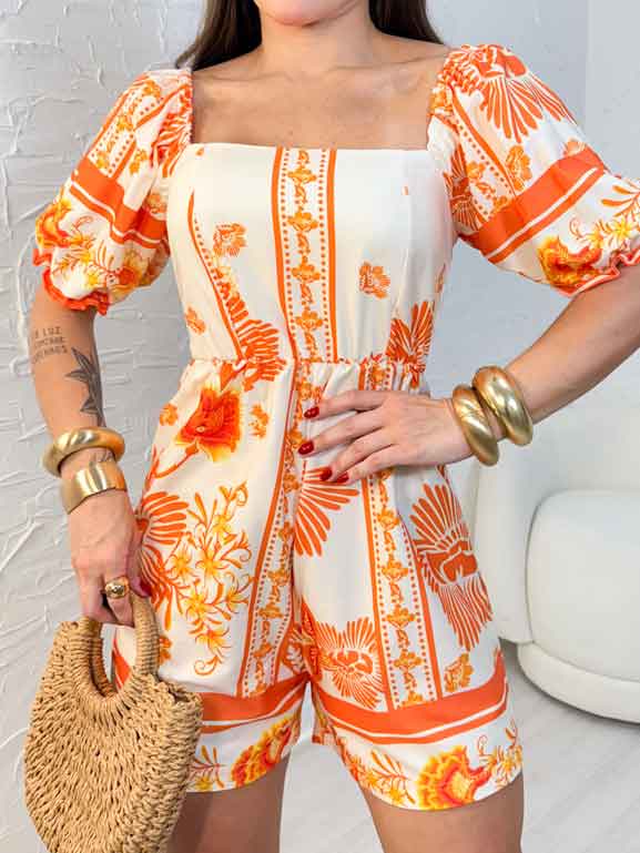 Produto: Macaquinho Estampado Caliente com manga princesa e lastex nas costas