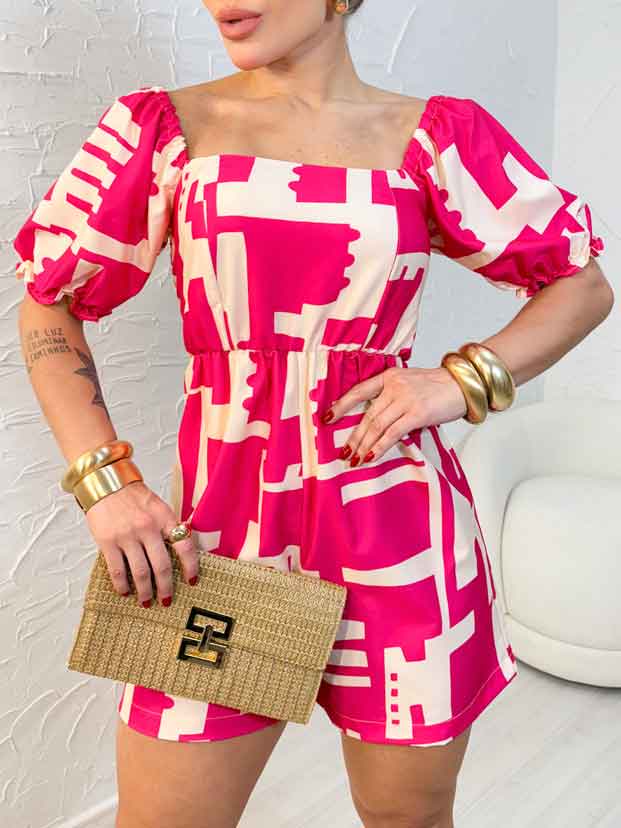 Produto: Macaquinho Estampado Portal com manga princesa e lastex nas costas